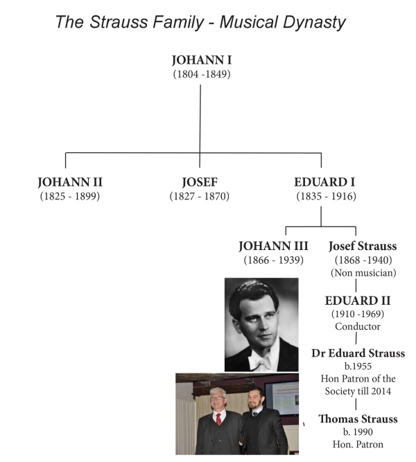 The family tree shows the musical members of the family plus our Hon. Patrons Dr Eduard Strauss and Thomas Strauss, our current patron. For a full family tree please visit (Note: external link): http://www.johann-strauss.at/biographie/stammbaum_neu_e.shtml